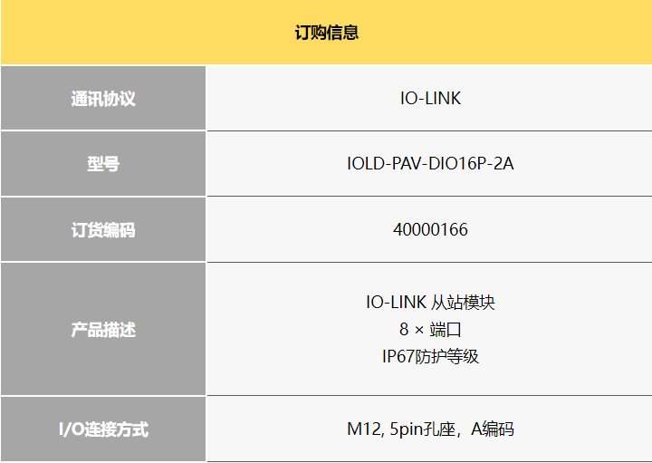 產(chǎn)品特點:通訊協(xié)議 IO-LINK 型號 IOLD-PAV-DIO16P-2A 訂貨編碼 40000166 產(chǎn)品描述 IO-LINK 從站模塊 8 × 端口 IP67防護等級 I O連接方式 M12, 5pin孔座,A編碼