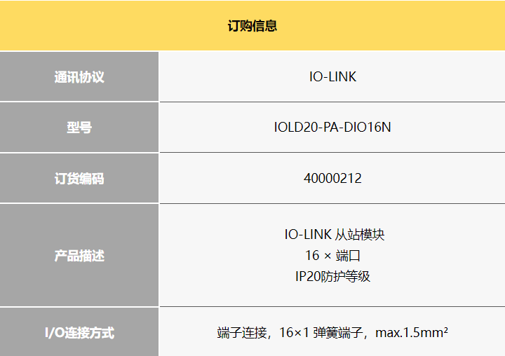 產(chǎn)品特點(diǎn):通訊協(xié)議 IO-LINK 型號(hào) IOLD20-PA-DIO16N 訂貨編碼 40000212 產(chǎn)品描述 IO-LINK 從站模塊 16 × 端口 IP20防護(hù)等級(jí) I O連接方式 端子連接,16×1 彈簧端子,max 1 5mm2