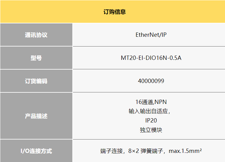 產(chǎn)品特點(diǎn):通訊協(xié)議 EtherNet IP 型號(hào) MT20-EI-DIO16N-0 5A 訂貨編碼 40000099 產(chǎn)品描述 16通道,NPN 輸入輸出自適應(yīng), IP20 獨(dú)立模塊 I O連接方式 端子連接,8×2 彈簧端子,max 1 5mm2