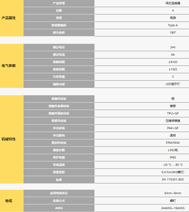 產(chǎn)品特點(diǎn):型號(hào) VAD-024-L-8 訂貨編碼 11680015 位數(shù) 4 產(chǎn)品描述 A型閥式 現(xiàn)場(chǎng)可接線式連接器 連接方式 A型閥(18mm) 防錯(cuò)插編碼 Type A