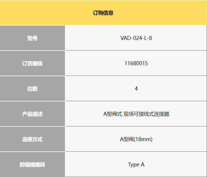 產(chǎn)品名稱:精奇A型閥式現(xiàn)場(chǎng)可接線式連接器VAD-024-L-8