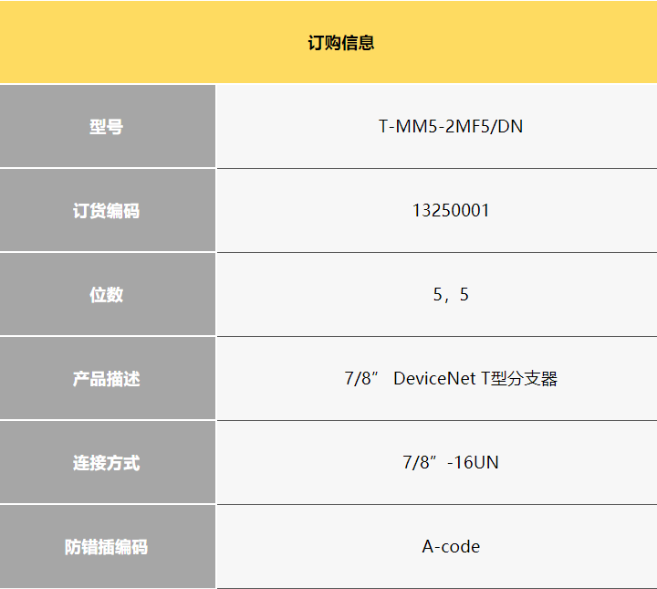 產(chǎn)品特點:型號 T-MM5-2MF5/DN 訂貨編碼 13250001 位數(shù) 5,5 產(chǎn)品描述 7/8” DeviceNet T型分支器 連接方式 7/8”-16UN 防錯插編碼 A-code