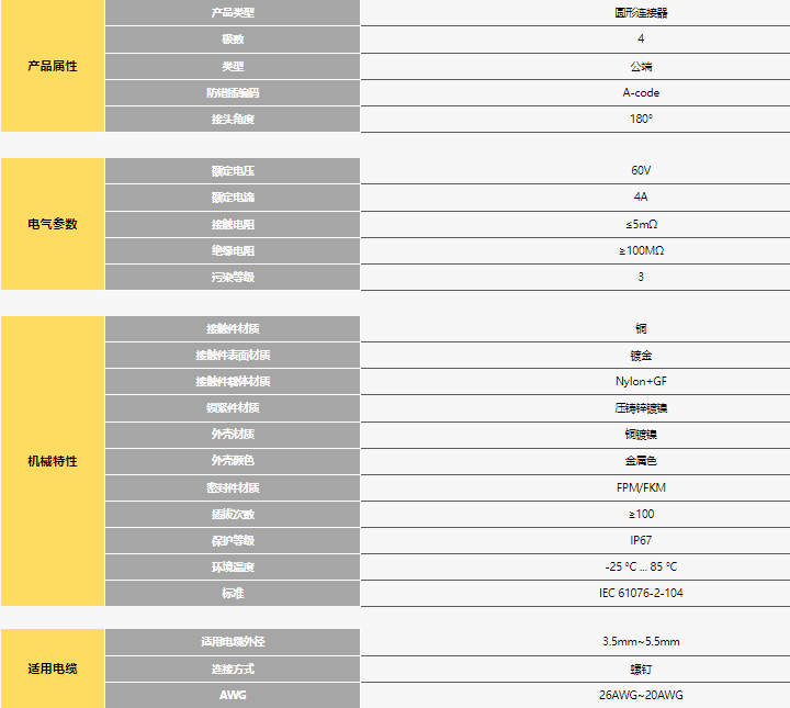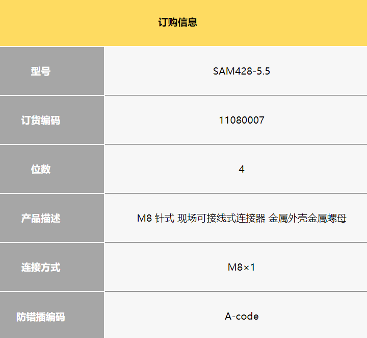 產(chǎn)品特點(diǎn):型號 SAM428-5.5 訂貨編碼 11080007 位數(shù) 4 產(chǎn)品描述 M8 針式 現(xiàn)場可接線式連接器 金屬外殼金屬螺母 連接方式 M8×1 防錯插編碼 A-code