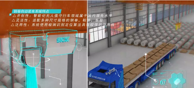 該3D掃描平臺基于LMS511設計,用于鋼卷自動化裝車。系統(tǒng)用于檢測停車在區(qū)域范圍內的車輛位置、鞍座位置,將這些數(shù)據發(fā)送到上位控制系統(tǒng)、配合天車吊具進行全自動裝車。