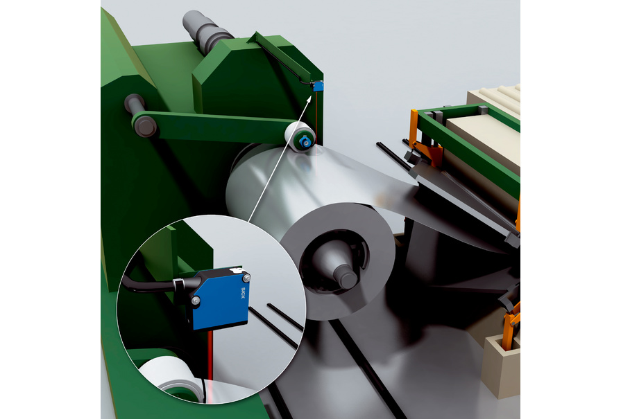 為了確保材料的恒定進料,必須調(diào)節(jié)金屬板卷材的開卷速度。距離傳感器 DT20 Hi 為此在整個開卷工序中連續(xù)測量金屬板卷材的半徑。增量型編碼器 DFS60 借助摩擦輥測量金屬板的拉取速度。兩個傳感器的測量值用于控制拉取速度,觸發(fā)自動卷材更換。