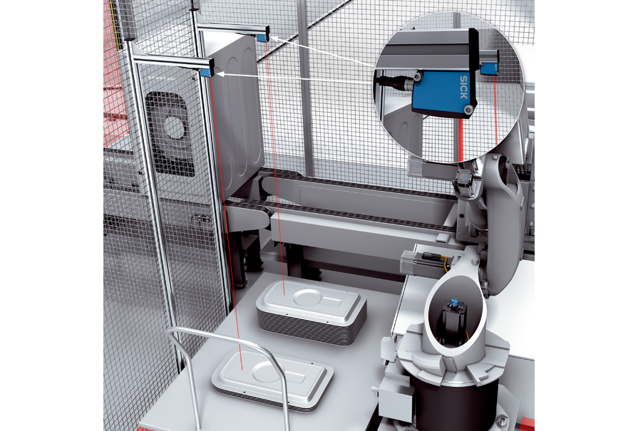中程距離傳感器 Dx35 測(cè)量金屬板垛的高度,以便為機(jī)器人提供相應(yīng)信息。因此,機(jī)器人可以精確地抓取板材。即使距離更遠(yuǎn),距離傳感器都可以非常精確地進(jìn)行測(cè)量和切換,不受物體顏色和物體表面影響。利用 IO-Link 接口,可以簡(jiǎn)便、低成本地用數(shù)字方式提供 Dx35 的距離值。