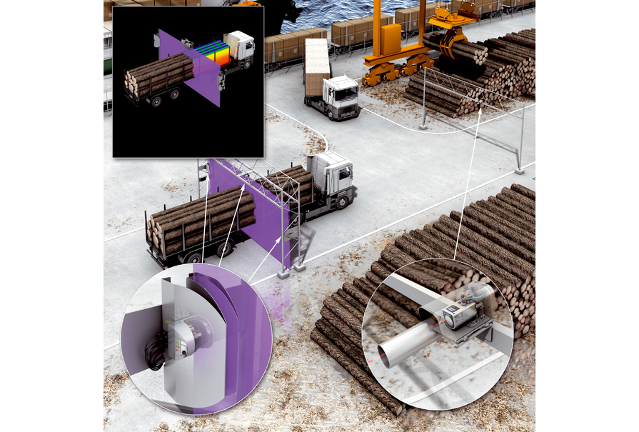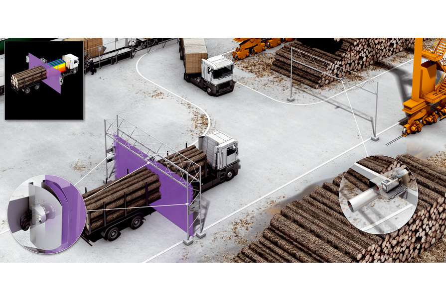 在為戶(hù)外應(yīng)用而開(kāi)發(fā)的 2D LiDAR 傳感器 LMS511 以及遠(yuǎn)程距離傳感器 DT1000 得出的測(cè)量數(shù)據(jù)的基礎(chǔ)上,通過(guò)分析軟件生成木材裝載的三維模型,由此可計(jì)算出原木的體積和長(zhǎng)度。
