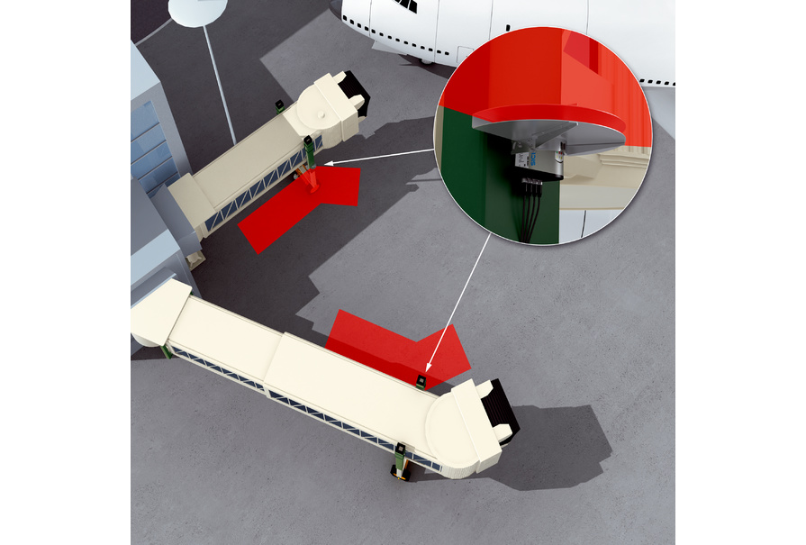為了在飛機(jī)乘員量大時保障快速的登機(jī)和離機(jī),飛機(jī)可接駁兩個飛機(jī)乘客登機(jī)橋。2D LiDAR 傳感器 LMS1xx 避免兩臺飛機(jī)乘客登機(jī)橋的碰撞。它們能各自對另一臺飛機(jī)乘客登機(jī)橋進(jìn)行實(shí)時檢測。