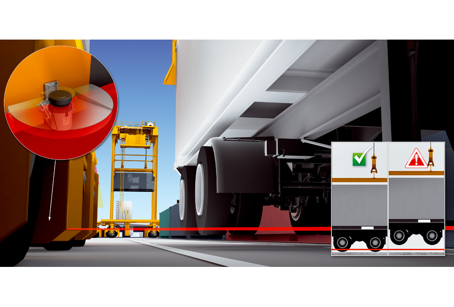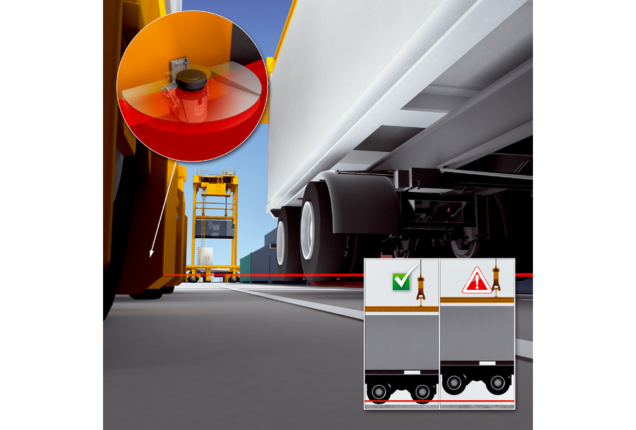 在用龍門吊將集裝箱從載重卡車起吊時(shí),有可能發(fā)生起重機(jī)將卡車一并吊起的情況。為檢測(cè)這種情況,可采用以下簡(jiǎn)便的方案:即通過(guò)安裝在龍門吊行駛軌道旁的二維激光掃描儀 LMS11x。在集裝箱卸貨時(shí),LMS11x 監(jiān)控卡車前后輪區(qū)域內(nèi)離地面約 30 cm 的位置。若龍門吊抬起集裝箱時(shí),載重卡車隨之被一并抬起,則起重機(jī)駕駛員收到相應(yīng)的信號(hào)并因而能夠停止卸貨。