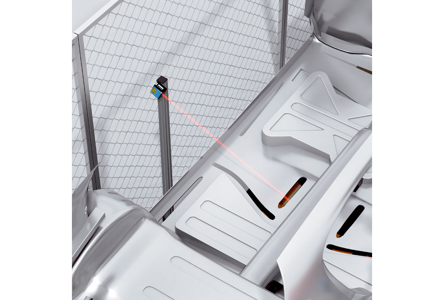 在機器人工作站運轉(zhuǎn)時,工作人員須檢驗各類板材。距離傳感器 DS50 能夠遠距離檢測小孔、縫隙及板材形狀,因此也可被安裝于機器人工作區(qū)域之外。該傳感器使用激光等級為 1 級的光斑。