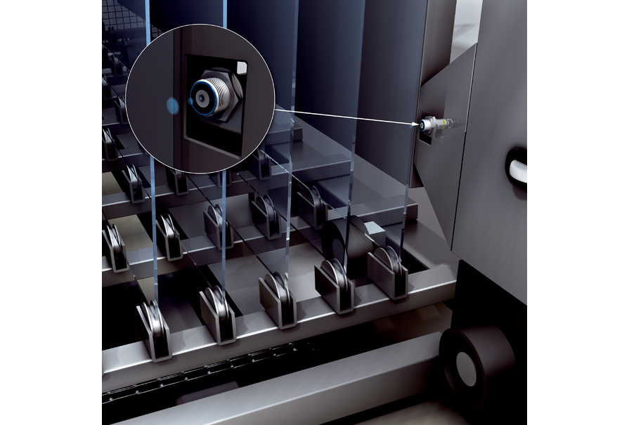為了控制設(shè)備供料,需要檢測(cè)玻璃板存放裝置中玻璃板的位置。超聲波傳感器 UM18 不受臟污、粉塵、潮濕和霧氣的影響,可選擇經(jīng)由模擬輸出或 IO-Link 輸出玻璃板位置。這可確保設(shè)備供料順暢。