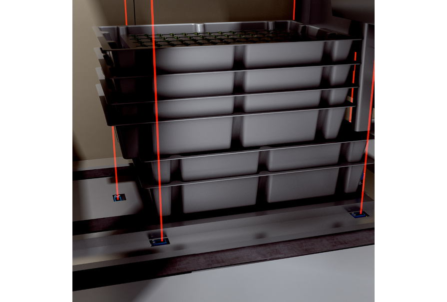 四臺(tái)鉗在地板中的反射式光電傳感器 W4-3 檢測(cè)托盤/堆垛是否有突出的部分,以及是否有傾斜的托盤。另外兩臺(tái)反射式光電傳感器識(shí)別傳送帶通過(guò)方向上的工件是否前端或后端突出托盤。帶有 IO-Link 的反射式光電傳感器尤其適合該任務(wù):其內(nèi)部的微控制器以最大時(shí)鐘頻率優(yōu)化處理檢測(cè)過(guò)程,從而無(wú)需在控制器中進(jìn)行費(fèi)時(shí)的信號(hào)處理。反射式光電傳感器 W4-3 因其特別清晰、細(xì)小而高準(zhǔn)度的光點(diǎn)而為人稱道,并由于該特點(diǎn)而在通過(guò)輸送帶之間的遮擋和空隙運(yùn)行時(shí)“一覽無(wú)余”。另一個(gè)漫反射式光電傳感器在托盤-堆垛進(jìn)入托盤運(yùn)輸機(jī)時(shí)檢測(cè)其高度,以免發(fā)生碰撞。