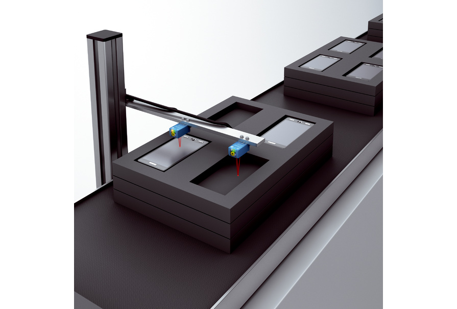 在將托盤轉(zhuǎn)運(yùn)到加工站時,WTV4FE V-Optics 漫反射光電傳感器會檢查托盤的占用情況。在此面臨的挑戰(zhàn)是物體表面(智能手機(jī))和背景(托盤底部)之間的間距較小。由于其類似激光的光點和有針對性地經(jīng)過匹配的 V-Optics 光學(xué)方案,甚至可以可靠地檢測透明物體,如顯示屏。