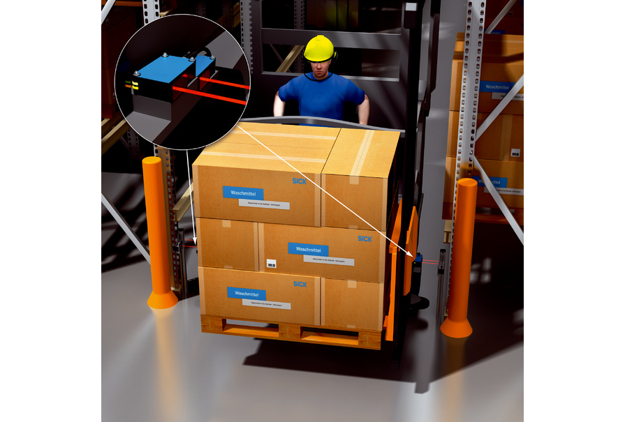 當(dāng)窄通道叉車(chē)駛?cè)胪ǖ罆r(shí),必須在窄巷道中自動(dòng)安全啟用人員防護(hù)系統(tǒng)。叉車(chē)上冗余的小型光電傳感器 W16 能夠可靠區(qū)分窄巷道的入口和出口。在通道外,人員識(shí)別裝置用作駕駛輔助系統(tǒng)。