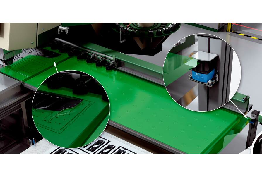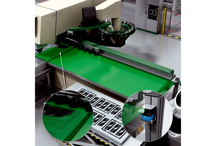 使用二維激光掃描儀 TiM3xx 用于識(shí)別拱形金屬板或傾斜的部件。TiM3xx 通過數(shù)字開關(guān)信號(hào)提示檢測(cè)到的物體,以此避免與刀具的碰撞??勺杂山o定參數(shù)的感測(cè)區(qū)域使其便于安裝及集成到機(jī)器上。也可選擇帶有 Pin-Point 準(zhǔn)確定位技術(shù)的微型光電傳感器,例如 W4S-3 ,用于識(shí)別凸起。W4S-3 可安裝在多個(gè)位置,光束平行于金屬板準(zhǔn)確校準(zhǔn)。由此可監(jiān)測(cè)金屬板的平整度。