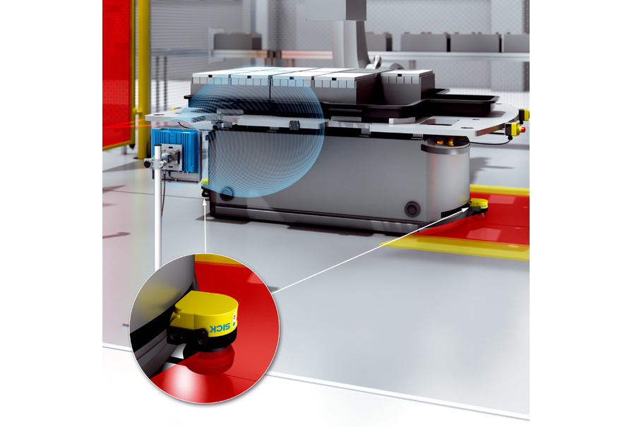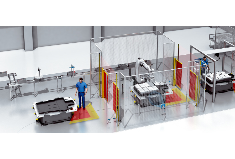 為在制造電池組時防護自動導航車,SICK 提供完整的組合。安全激光掃描儀 S300 Mini Remote 與安全控制器、安全編碼器和緊急停止按鈕相結合,為人員和機器提供保護。