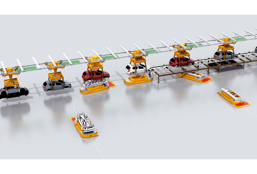 合裝前,工作人言需檢查車架包括動(dòng)力系統(tǒng)與車身是否相連。讀寫頭 RFH630 可以識(shí)別固定在位于自動(dòng)導(dǎo)航車上的裝配滑撬之上的無線射頻識(shí)別應(yīng)答器。無線射頻識(shí)別應(yīng)答器中存儲(chǔ)的信息用來為裝配滑撬分配制定的生產(chǎn)任務(wù)。