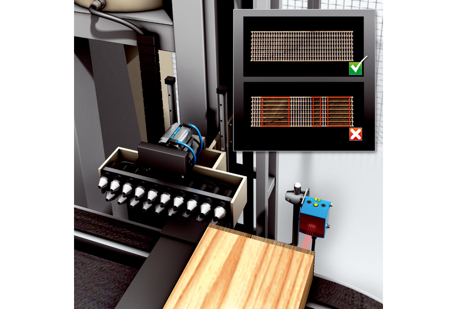 憑借出色的光澤度檢測,光澤度傳感器 Glare 可檢查噴在木板條正面的膠水。由此及早發(fā)現(xiàn)膠水容器變空等錯(cuò)誤來源和監(jiān)控生產(chǎn)質(zhì)量。