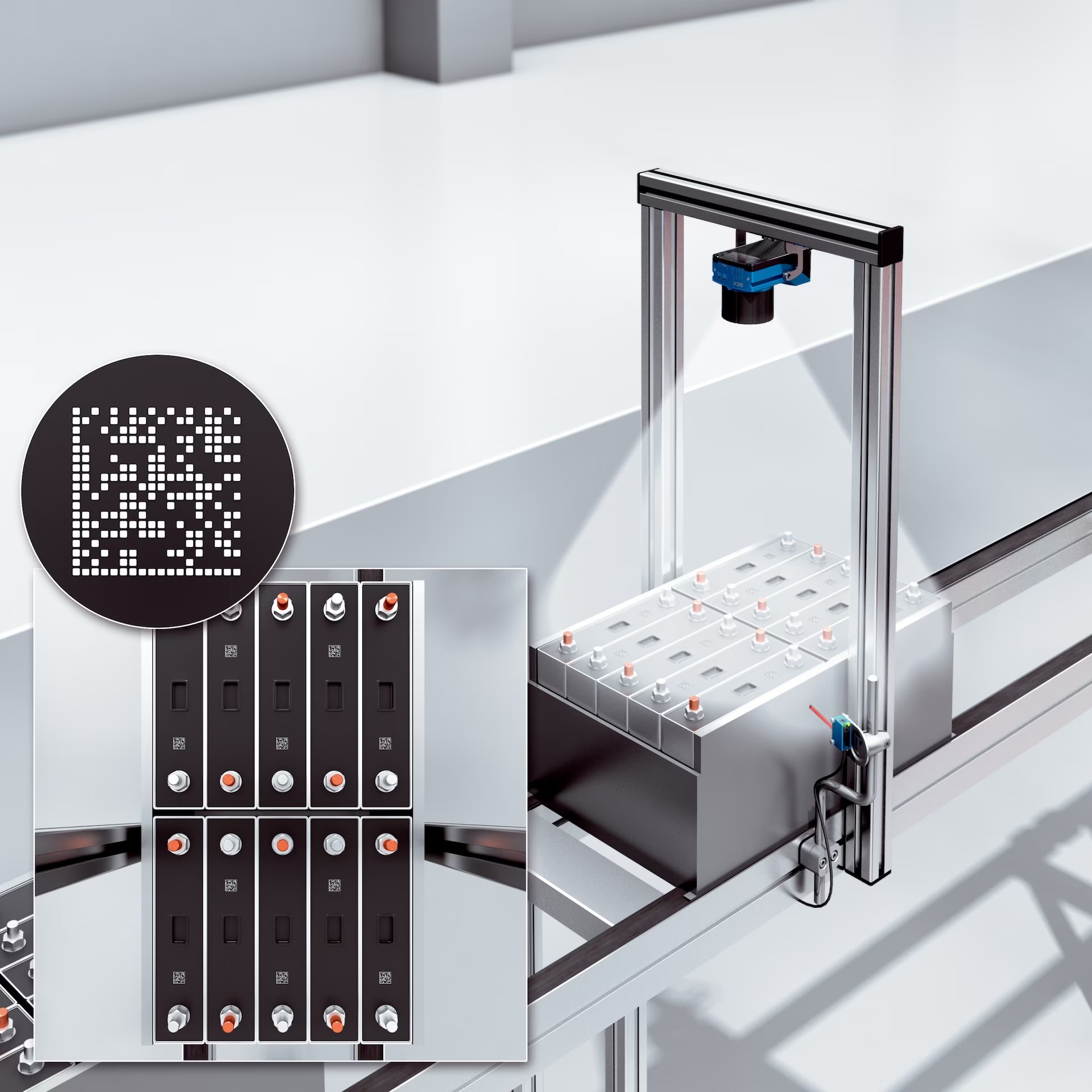 基于圖像的讀碼器 Lector63x 能夠識別電池模塊的所有代碼并分配各個單元。通過大視域和高景深,Lector63x 提供代碼位置、物體高度和運輸速度方面的高度靈活性。