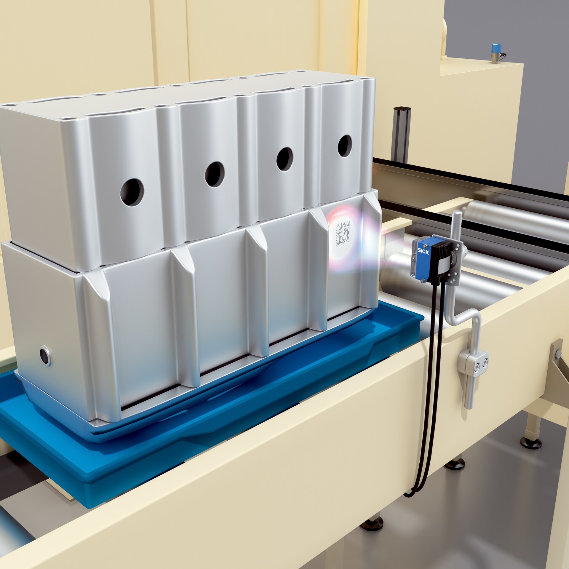 為了保證發(fā)動機缸體生產(chǎn)過程中的無縫可追溯性,氣缸頭上帶有點陣二維碼。即使在發(fā)亮的表面,基于圖像的讀碼器也能可靠地識別二維碼,不受表面特性的影響。所有讀碼器都具有性能強大的 DPM 解碼器。為了保證理想的讀取效果,根據(jù)產(chǎn)品系列,有可單獨更換的照明裝置,或者具有不同可調(diào)性的靈活照明方案可用。選裝配件,例如偏振過濾器可以無縫加裝。