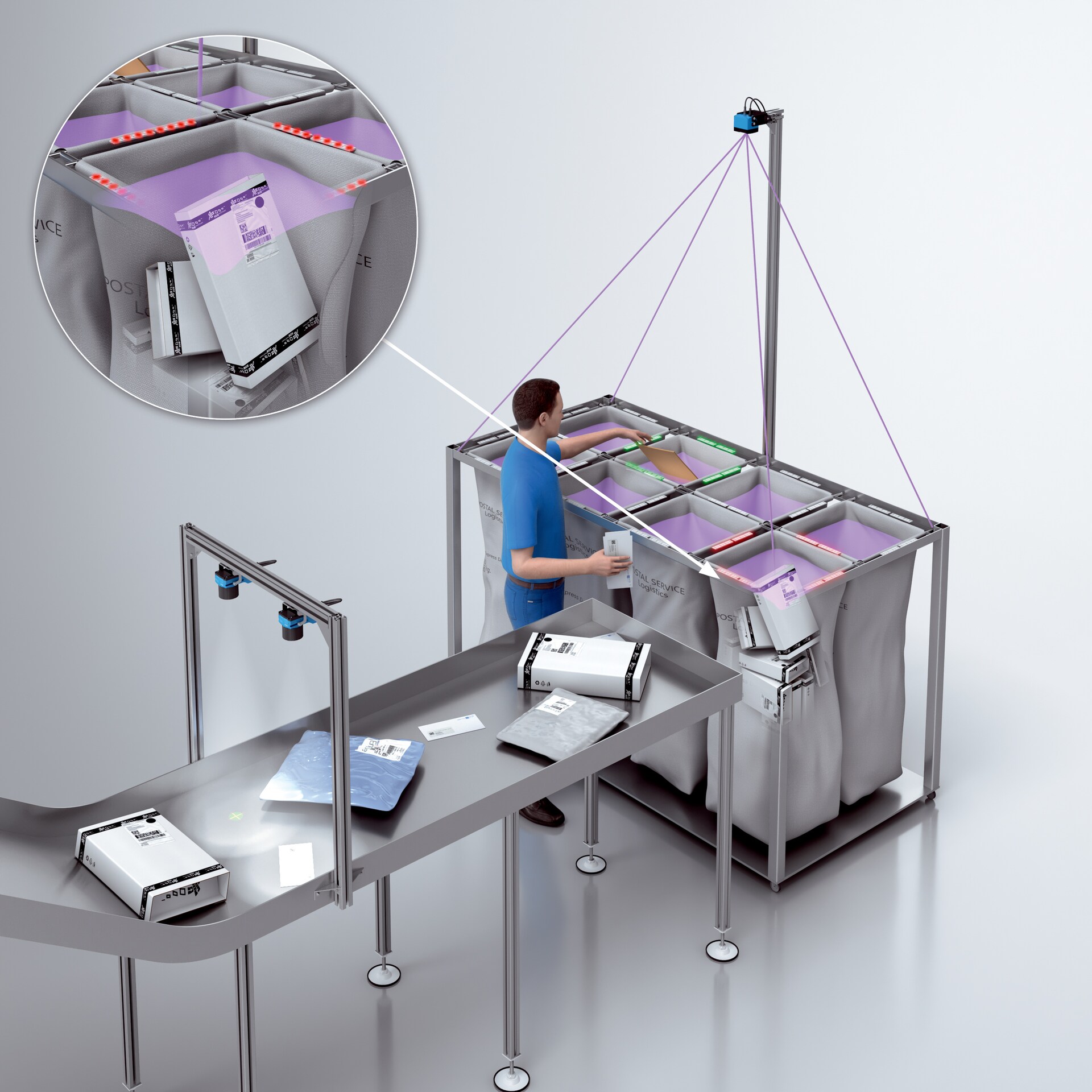 如果包裹和郵件貨物在裝載前被手動(dòng)分揀到收集容器中,錯(cuò)誤的拋擲可能會(huì)導(dǎo)致貨物丟失。SICK 的視覺分揀輔助工具為操作人員在卸貨滑道處分揀貨物時(shí)提供支持。首先,基于圖像的讀碼器 Lector6xx 讀取在終點(diǎn)處拋出的所有物體的發(fā)貨標(biāo)簽。正確的目標(biāo)容器上的 LED 亮起彩色。工人現(xiàn)在可以明顯更快地進(jìn)行分揀,并且錯(cuò)誤率降低。3D 快照視覺攝像機(jī) Visionary-T Mini 還可以確定貨物是否已被拋入正確的容器中。利用視覺攝像機(jī)的 3D 數(shù)據(jù),可以在容器上邊緣的下方進(jìn)行測量。因此,可以排除由操作人員的手和手臂以及由經(jīng)過的貨物造成的誤檢測。此外,還可以測量收集容器的液位。當(dāng)容器已滿時(shí),會(huì)自動(dòng)啟動(dòng)更換。