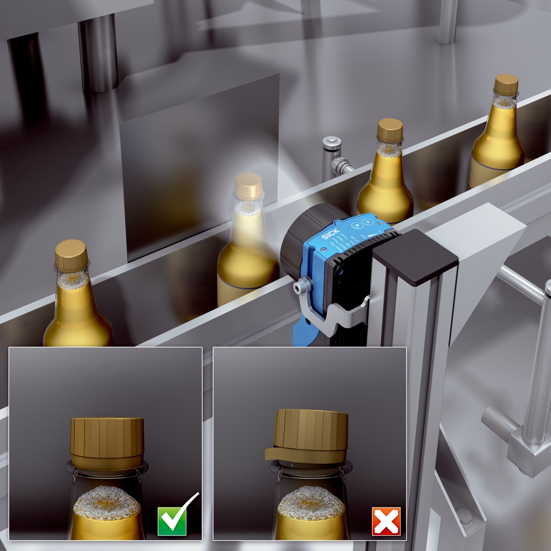 必須檢查每個經(jīng)過灌裝的瓶子是否可靠地壓蓋。2D 視覺傳感器 InspectorP6xx 非常靈活,可檢查所使用任何瓶蓋的放置方式和擰緊位置并識別擰緊錯誤??奢p松配置在不同瓶蓋之間的轉(zhuǎn)換。 作為替代方案,也可使用產(chǎn)品系列 WFE 中的兩個槽形傳感器實現(xiàn)此應(yīng)用。第一個 WFE 槽形傳感器檢查輸入?yún)^(qū)域中的瓶蓋是否存在及位置是否正確,第二個傳感器檢查瓶蓋是否正確地位于瓶子上。