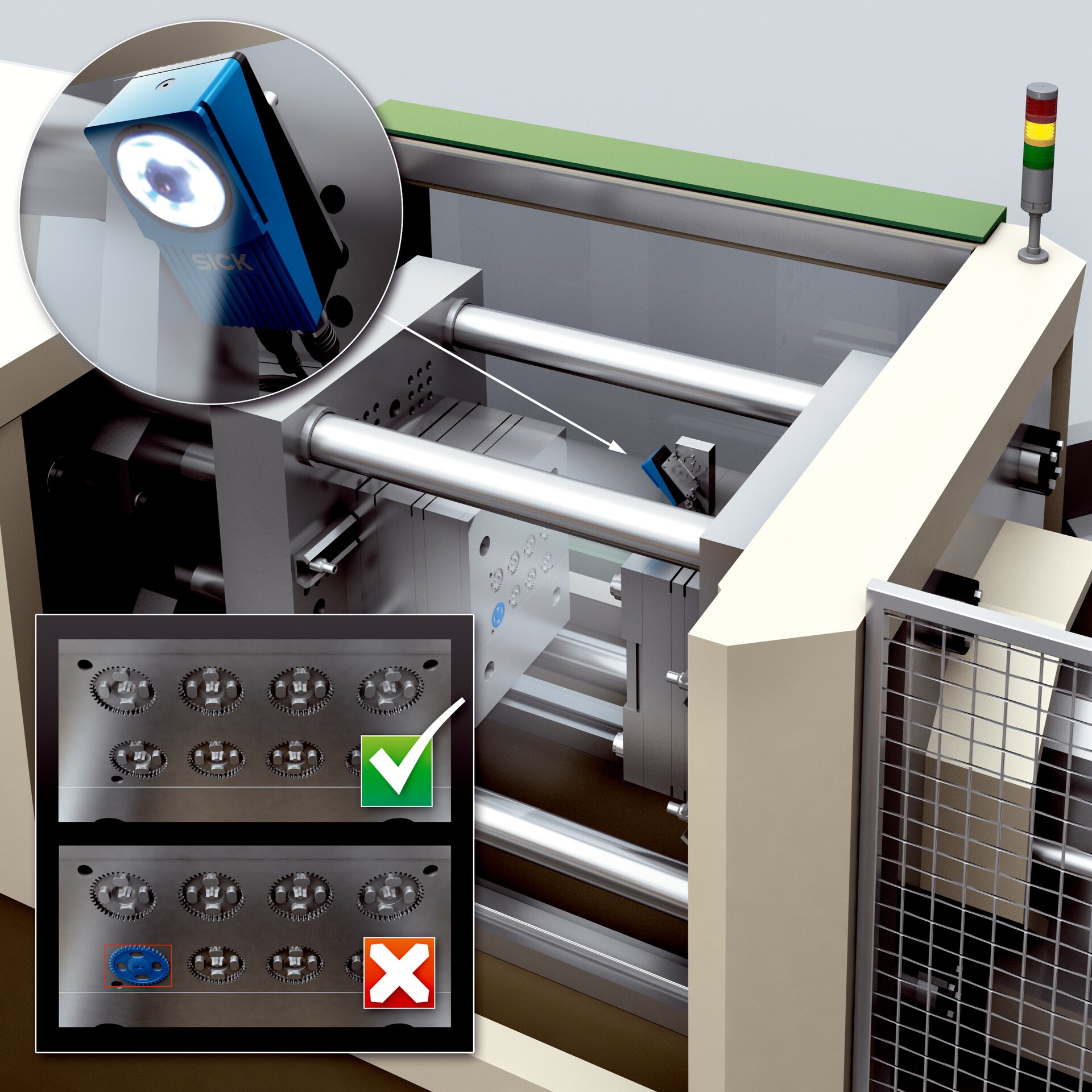 當注塑模具再進入時,未落下的部件可能損壞該模具并導(dǎo)致停機。視覺傳感器 Inspector 能可靠地識別是否所有部件均正確脫模,或是否射出口側(cè)的模具半體部件仍附著著。