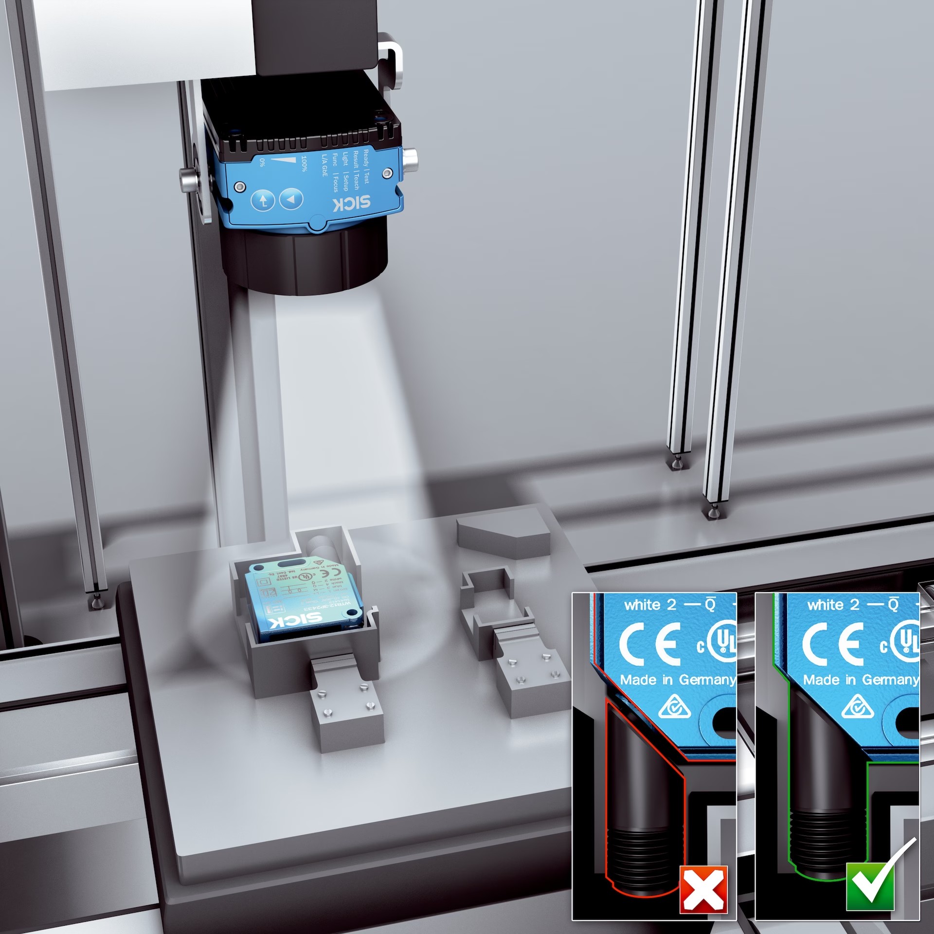 裝配好的產(chǎn)品須進行完整的質(zhì)量監(jiān)控測試。2D 視覺傳感器 InspectorP6xx 檢查和測量產(chǎn)品外殼與電纜接口的外形與輪廓,并將外形與輪廓數(shù)據(jù)與示教數(shù)據(jù)集進行對比。由此能夠可靠地識別和排除有缺陷的部件。