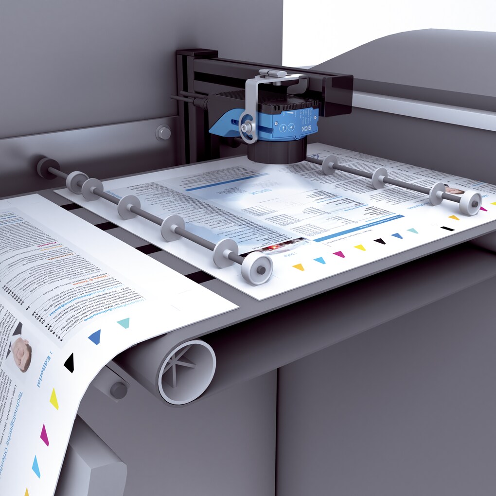 視覺傳感器 InspectorP 將每張打印圖像與預(yù)置樣本相比對。以此可以重新調(diào)整位置偏移,安全可靠地檢測錯誤進紙并同時將其提取。