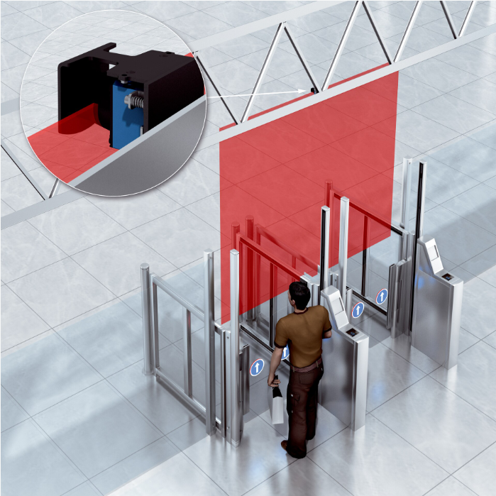 二維激光掃描儀能夠在自動登機門處監(jiān)控轉動門的上方區(qū)域。如果人員未被允許進入,則會啟用激光掃描儀。如果人員試圖翻越自動登機門,則會立即觸發(fā)警報信號。