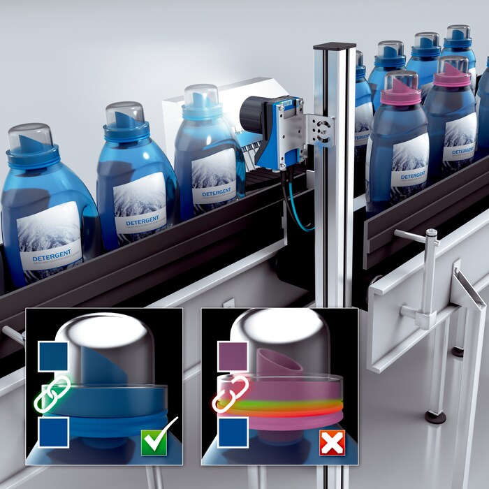 必須檢查經(jīng)過(guò)灌裝的瓶子是否可靠地壓蓋。為此,使用 2D 視覺(jué)傳感器 Inspector83x。該設(shè)備可檢查多個(gè)不同瓶蓋的位置,可靠地識(shí)別壓蓋錯(cuò)誤。為此,傳感器事先借助 AI 功能經(jīng)過(guò)不同瓶蓋和壓蓋錯(cuò)誤的訓(xùn)練。如此實(shí)現(xiàn)簡(jiǎn)單的傳感器配置和傳感器調(diào)試。此外,Inspector83x 在運(yùn)行過(guò)程中還表現(xiàn)出高度的靈活性:例如更換產(chǎn)品后可快速示教新瓶蓋。