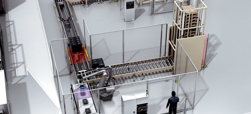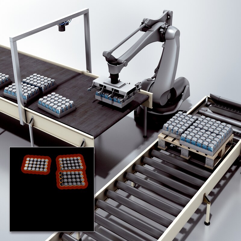 終端包裝機器人將包裝好的食品或飲料堆疊到托盤上。視覺系統(tǒng)快速可靠地識別輸送帶上的包裹位置。根據(jù)提供的信息,機器人夾具可自行抓取任意擺放的包裹并將其堆疊在托盤上。