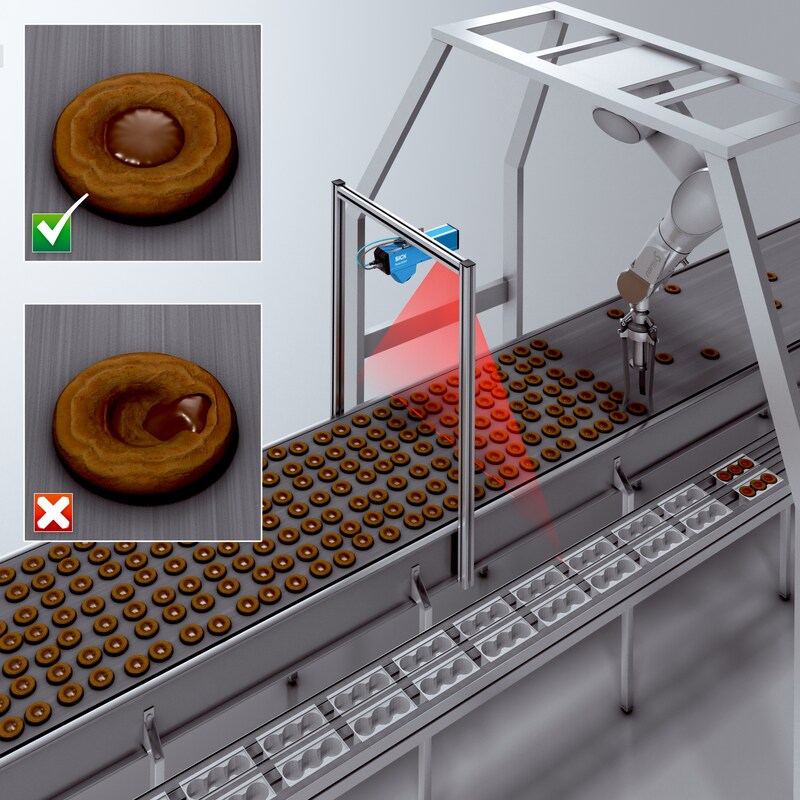 在包裝烘焙食品和糖果之前,必須確保產(chǎn)品質(zhì)量符合生產(chǎn)商和消費(fèi)者的高要求。必須及早識(shí)別出有缺陷的產(chǎn)品,并將其從生產(chǎn)流程和包裝流程中剔除。3D 視覺(jué)傳感器 Ruler3000 能夠?qū)Ω鞣N烘焙食品和糖果進(jìn)行高效的 3D 測(cè)量。即使在高流程速度下,它也能正確可靠地檢查其產(chǎn)品特性,例如形狀和尺寸。通過(guò)這種方式,該傳感器確保了只有高質(zhì)量的烘焙食品和糖果才能進(jìn)入包裝流程,即使沒(méi)有顏色對(duì)比亦是如此??蛇x的不銹鋼外殼甚至可承受強(qiáng)力清洗。