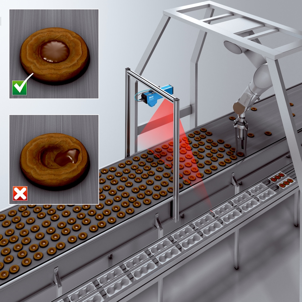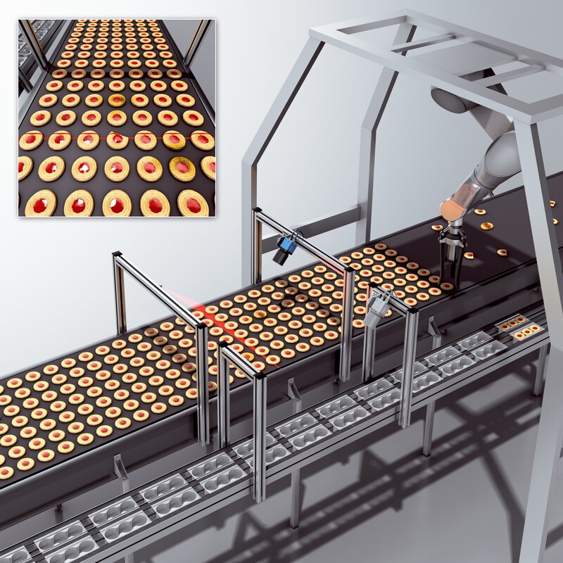 消費者希望得到質(zhì)量穩(wěn)定的烘焙食品。在取放機器人將烘焙食品放入包裝單元前,3D 視覺傳感器 Ranger3 檢查待包裝食品的形狀是否符合基本質(zhì)量標準以及有無瑕疵。
