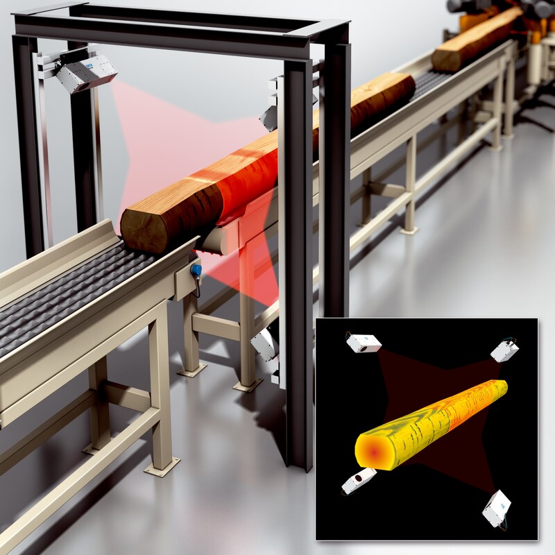 為優(yōu)化需在后續(xù)仿形設(shè)備和鋸切設(shè)備中切開的側(cè)板,使用流媒體攝像機(jī) Ruler E 生成方木輪廓的準(zhǔn)確三維圖像。得益于流媒體攝像機(jī)的激光光散射技術(shù),這些數(shù)據(jù)也包含樹結(jié)位置以及樹干曲率和橢圓度。通過視覺集成器可將多臺流媒體攝像機(jī) Ruler E 組合成性能強(qiáng)大的三維掃描系統(tǒng)。